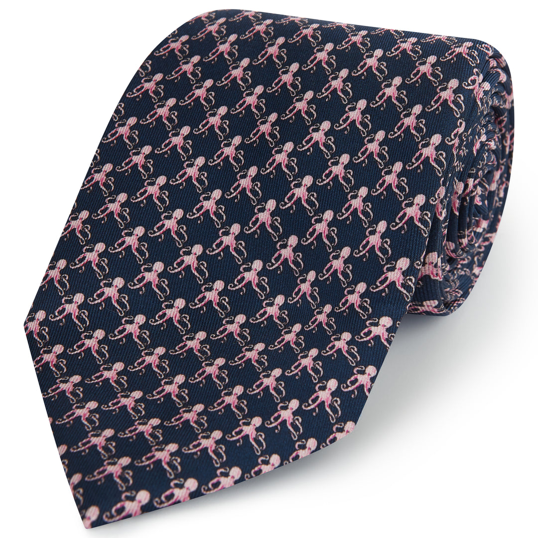 Navy Pink Octopus Printed Silk Tie
