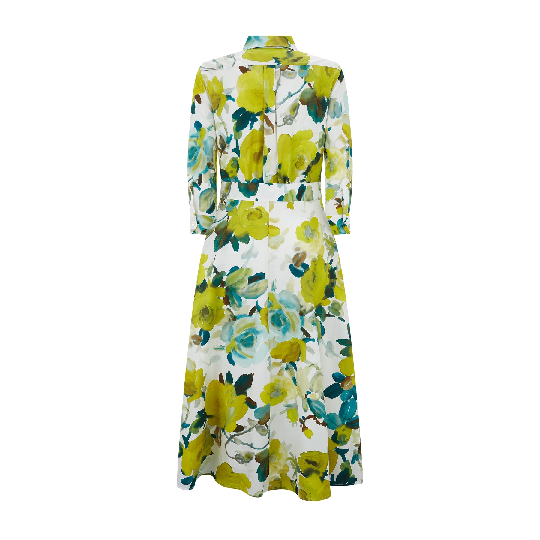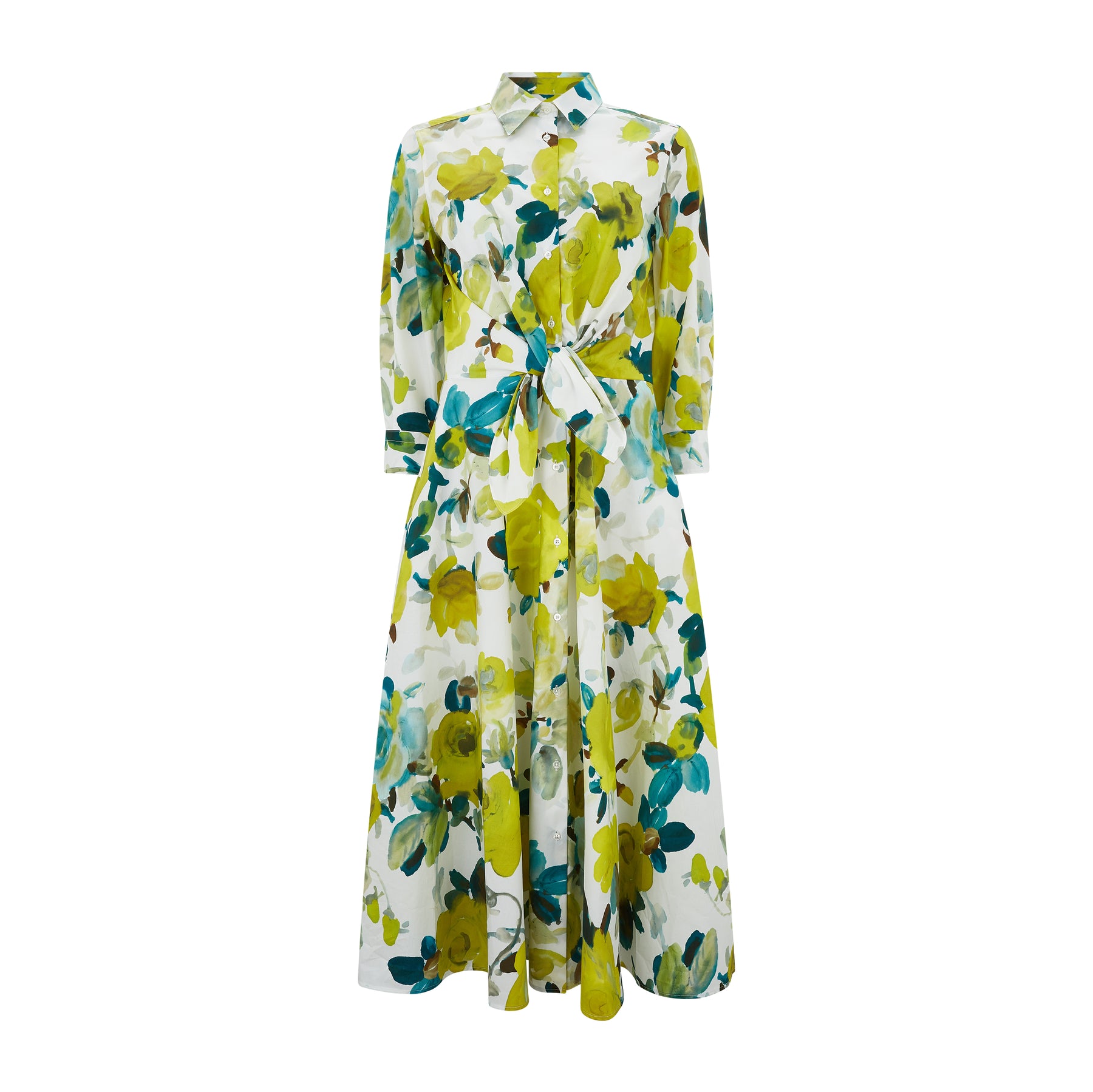 The Dralla85 midi length ¾ sleeve button down tie front shirtdress with flared skirt features a floral print in cotton poplin multicolour lime aqua and teal on a white ground.