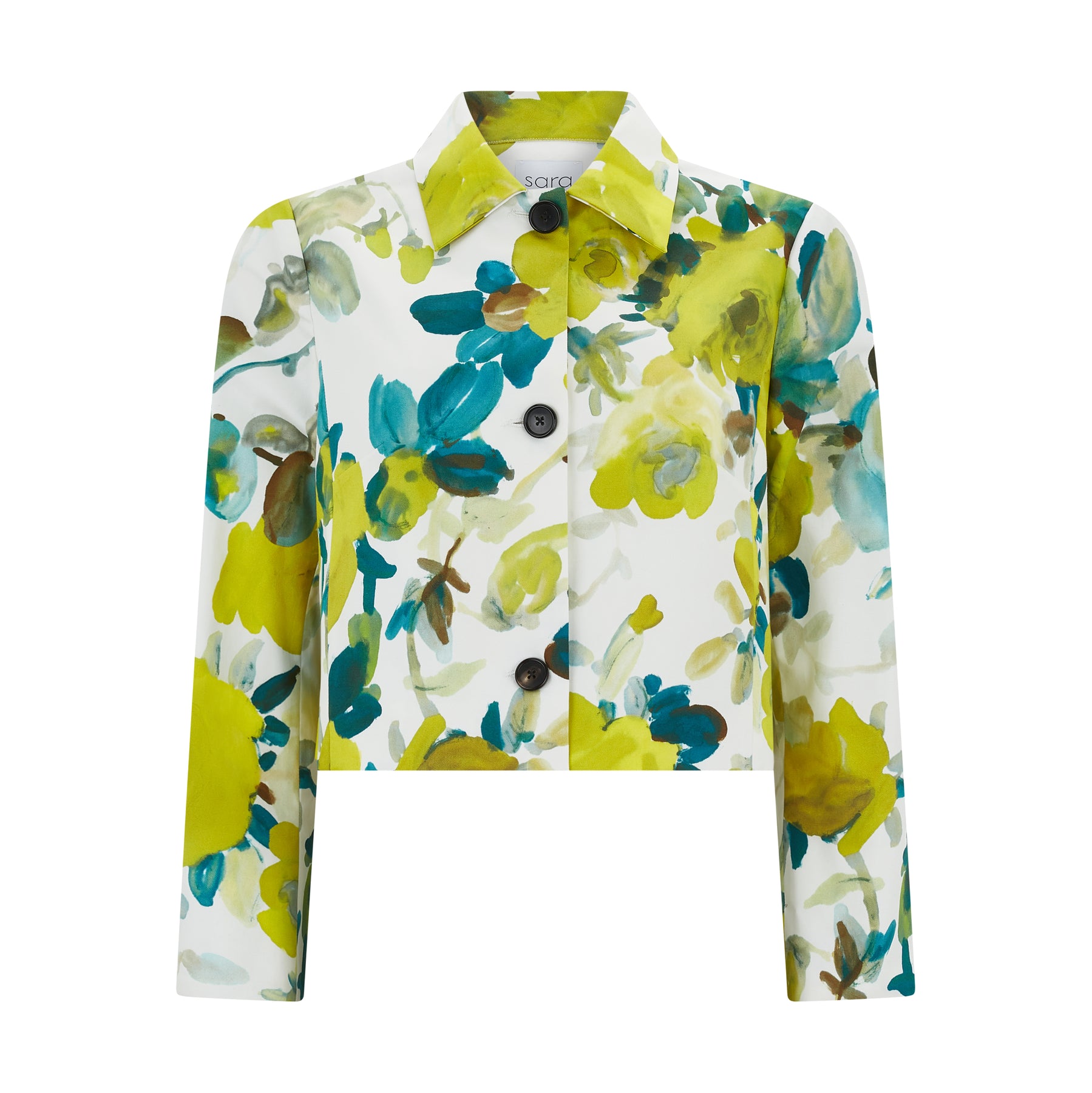 The Rosae short button front jacket in floral print, features a cropped silhouette with large collar and bold watercolour style floral patterns in shades of yellow, green, and teal hues on a crisp white background. Classic button front with a split opening detail on the sleeve. Pair with the matching Dralla85 Tie front flower cotton dress.