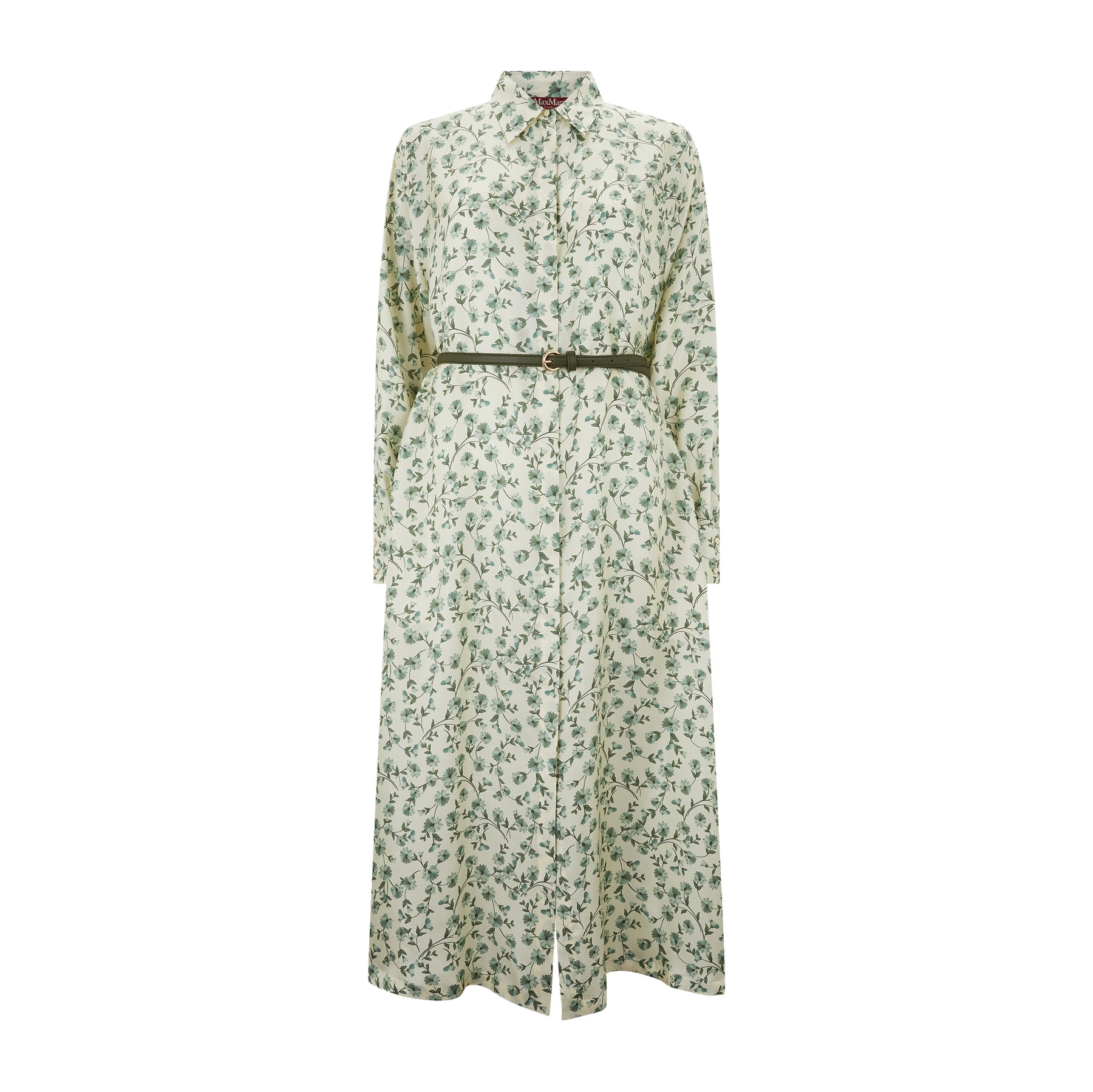 Max Mara midi shirt dress with an all-over printed floral motif and a matching leather belt. This dress features flared fit with side slit detail at the hem, long set-in sleeves, shirt collar and cuffs with jewel buttons. Front closure with concealed buttons. Pair with the casa trousers for the full tailored outfit.
