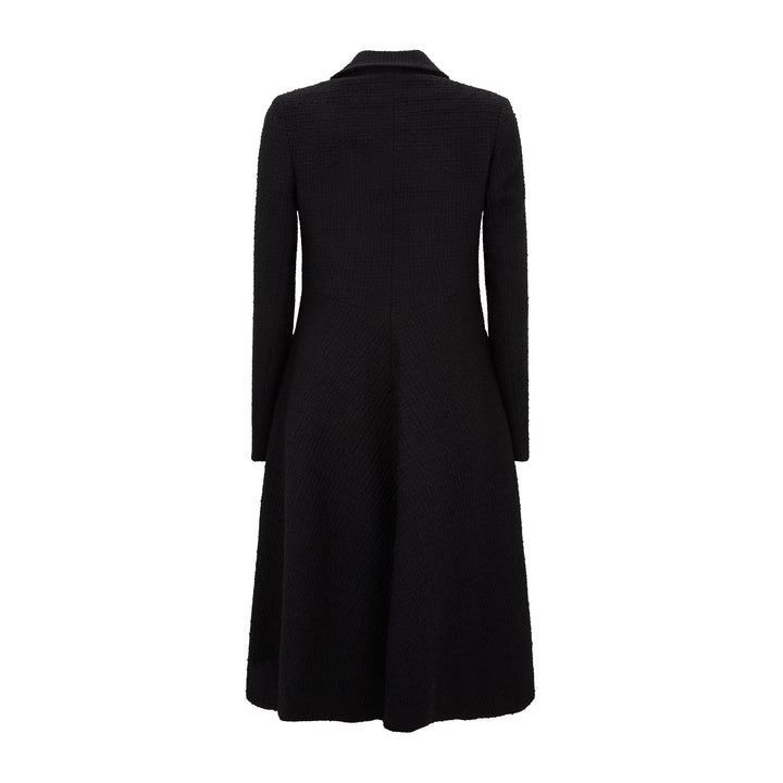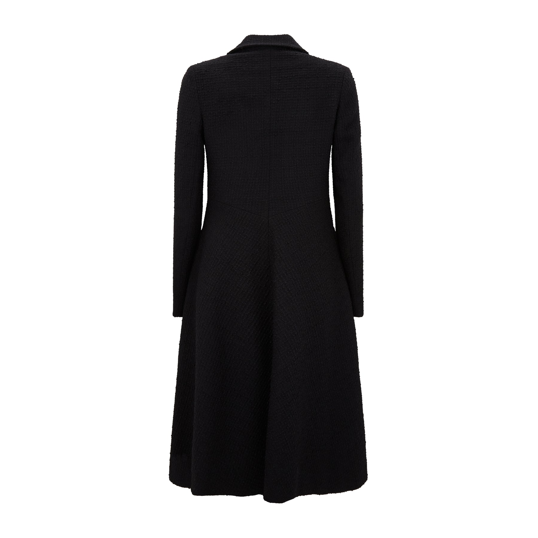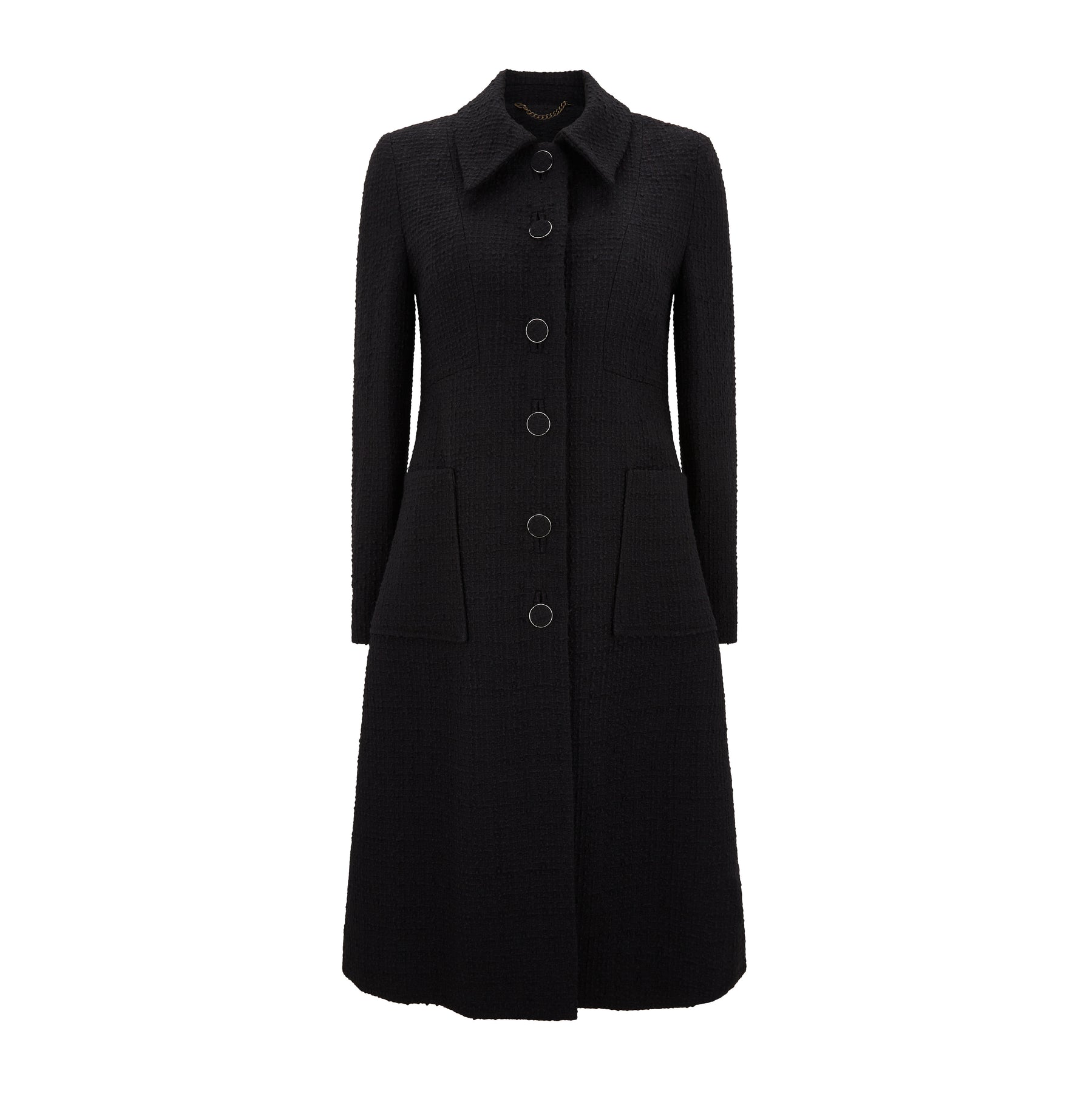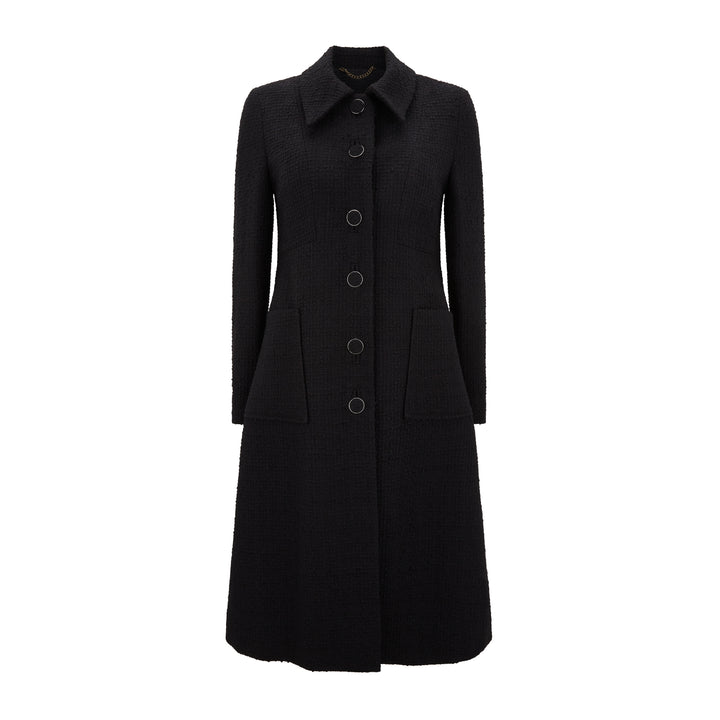 Jane Verona tweed coat features a pointed collar and large retro pockets. Featuring shaped front panels and a curved back waist seam with a bias cut to create fluidity. Finished with covered buttons with silver surrounds in bound buttonholes. Pair with Stella summer tweed shirt and Solane summer tweed pencil skirt for the full look.