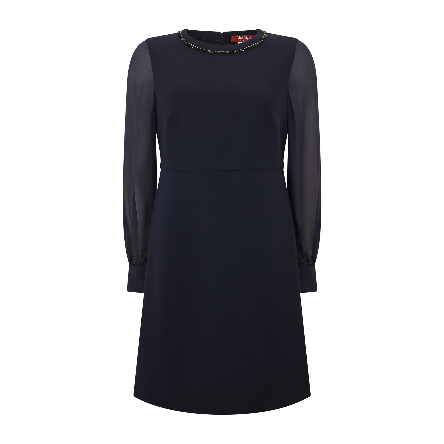 Max Mara short cocktail dress, embellished by piping embroidered with beads on the neckline. This dress features crew neckline, long sleeve in pure silk georgette and shirt cuffs with jewel buttons, seam at the waist. Back zip for fastening. Also available in Black.