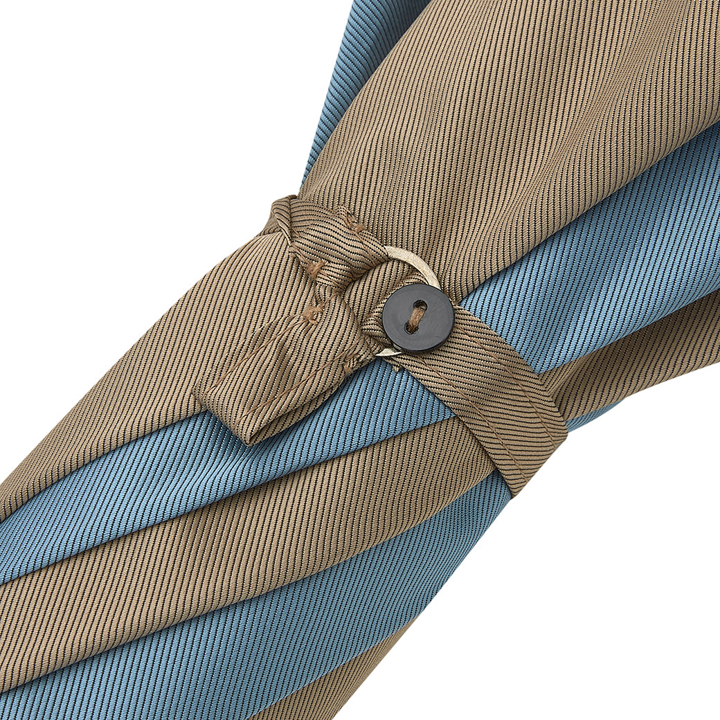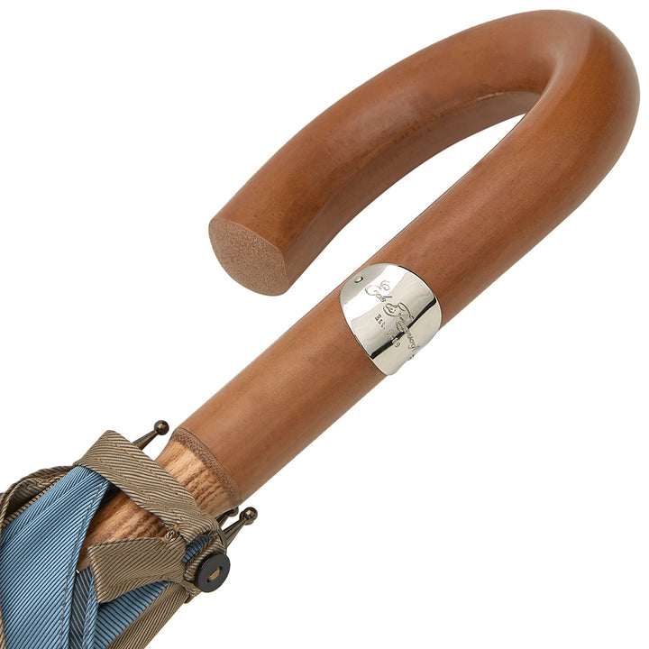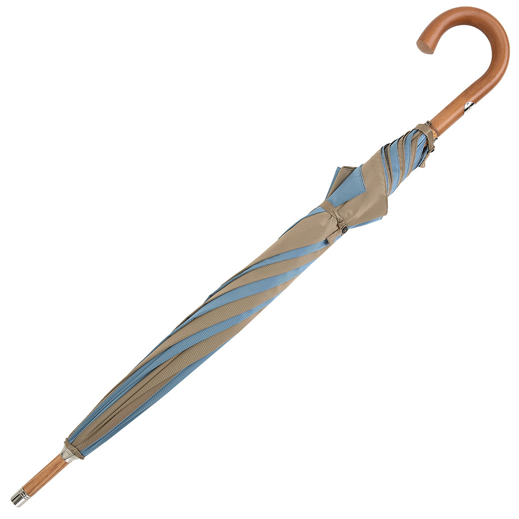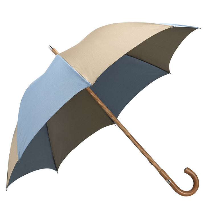 This umbrella is entirely handcrafted at a fifth-generation Milanese atelier. Handmade in Italy there are 70 individual steps to make a finished piece. This style features a Malacca wood handle, solid two colour canopy. A solid umbrella is made from one continuous piece of wood throughout, this means the handle and shaft are one piece, therefore, almost as strong as a walking stick and can also be used as a walking aid.