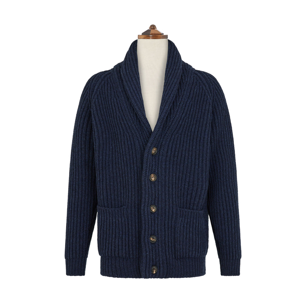 The Kelso ribbed knitted wool cardigan is made in Scotland from 100% lambswool. It features a shawl collar and five horn buttons, giving it a classic look that fits perfectly under outerwear. Also available in Burgundy.