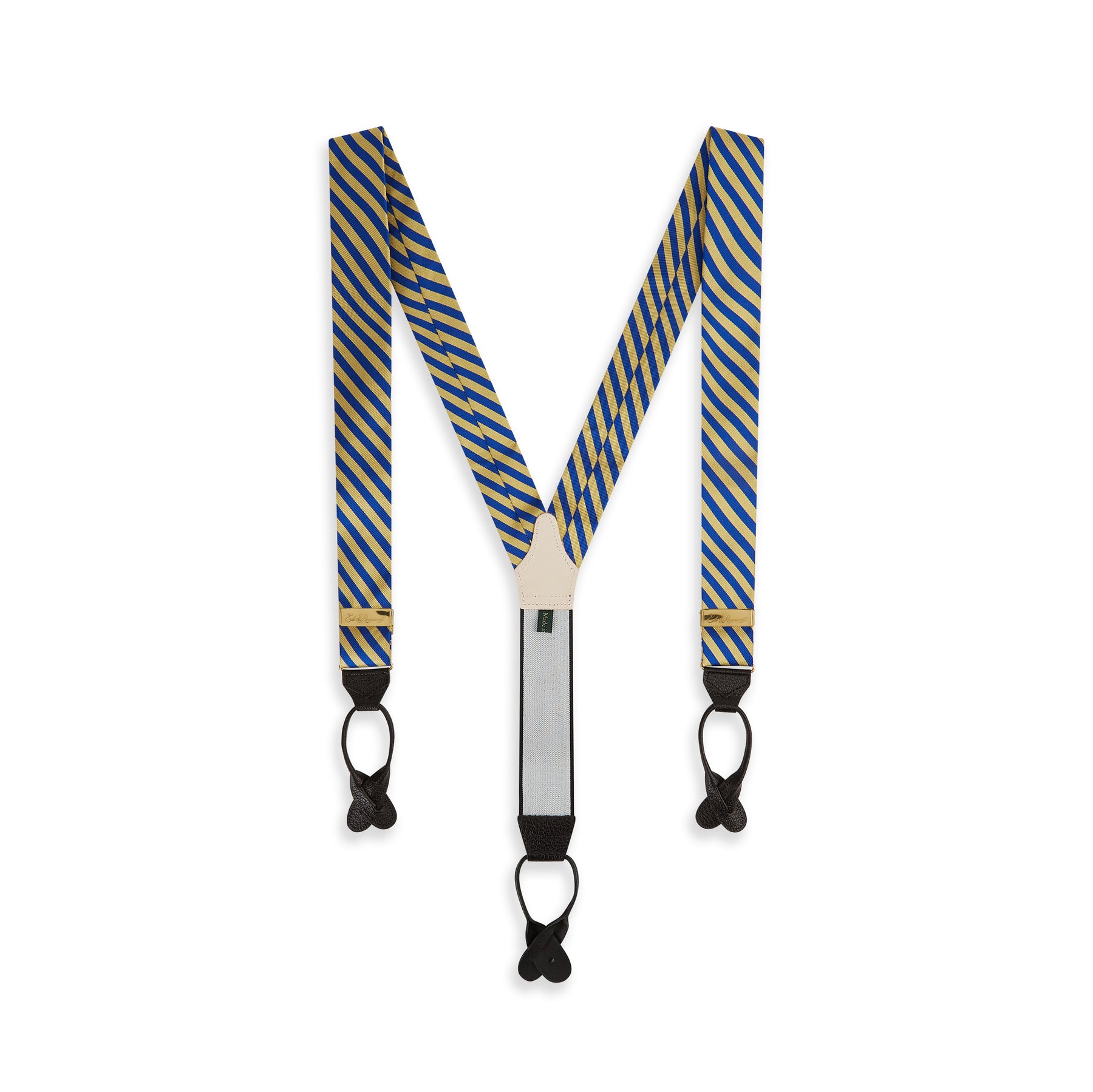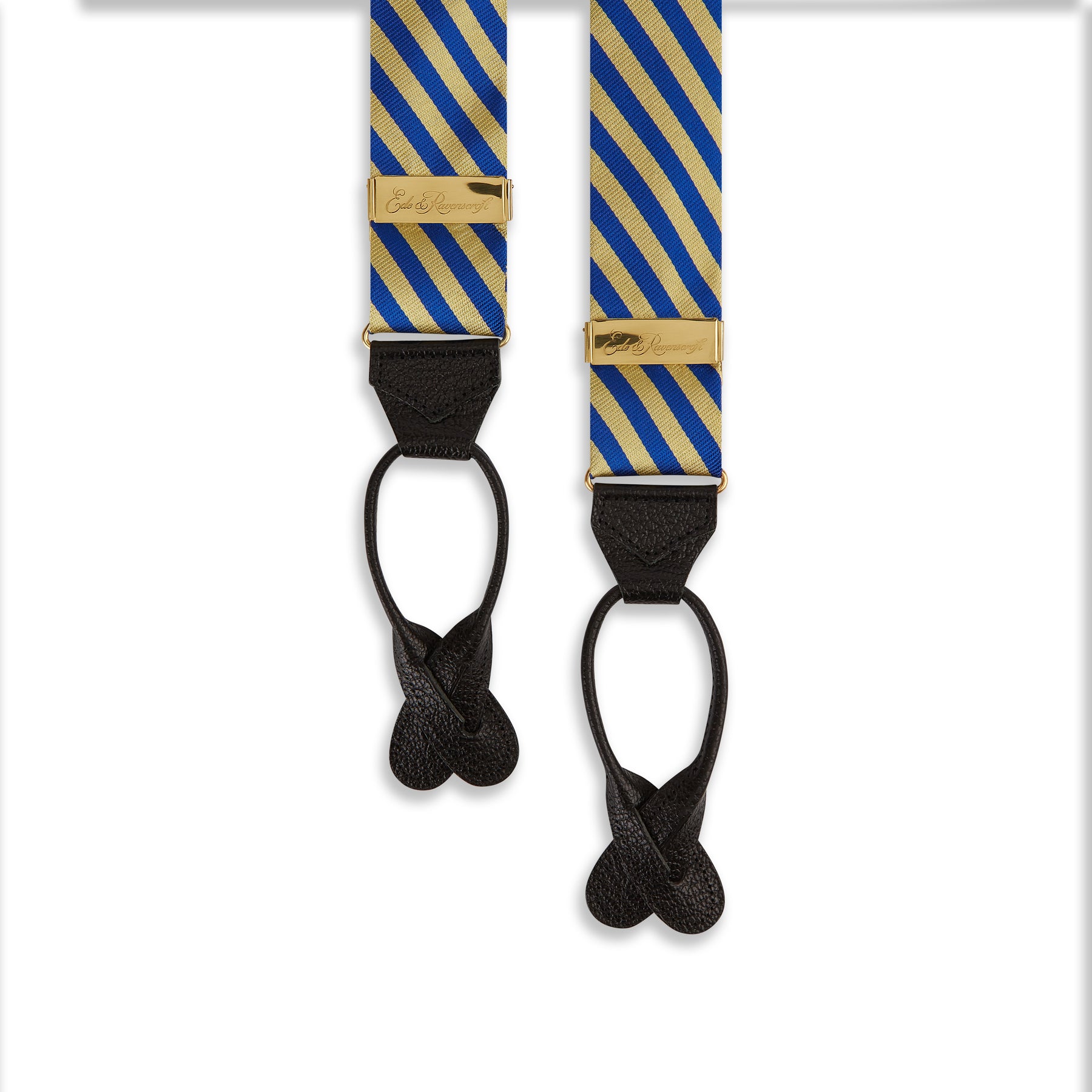 Crafted in England these silk braces in the colours of Lincoln's Inn feature black leather button ends and engraved hand polished brass levers. Fully adjustable they make a stylish alternative to a belt.