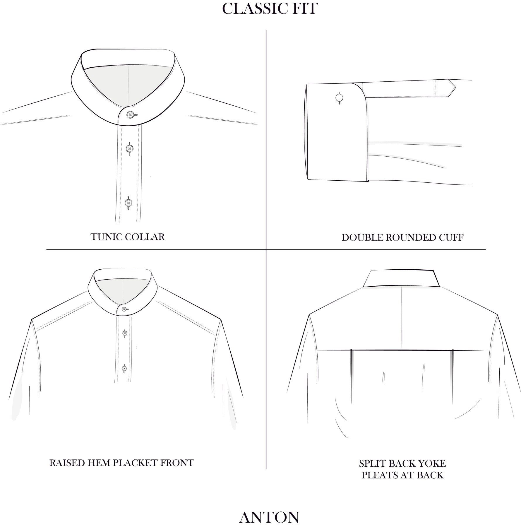 The Anton shirt in our classic fit is a generous cut offering maximum comfort. Offered in a two-fold cotton poplin this tunic shirt with double cuffs and separate collar is ideal courtwear. Also available in Tailored Fit