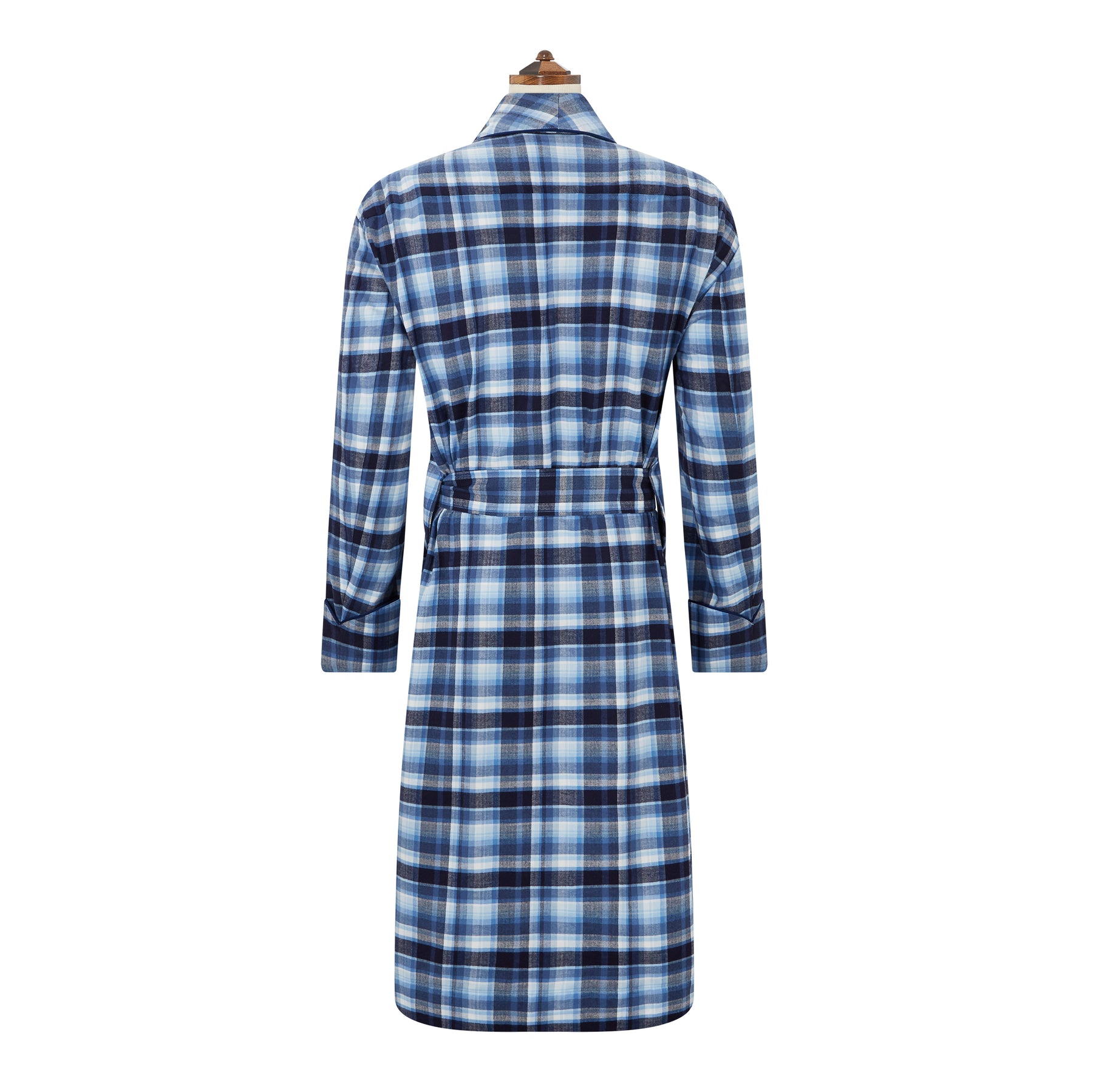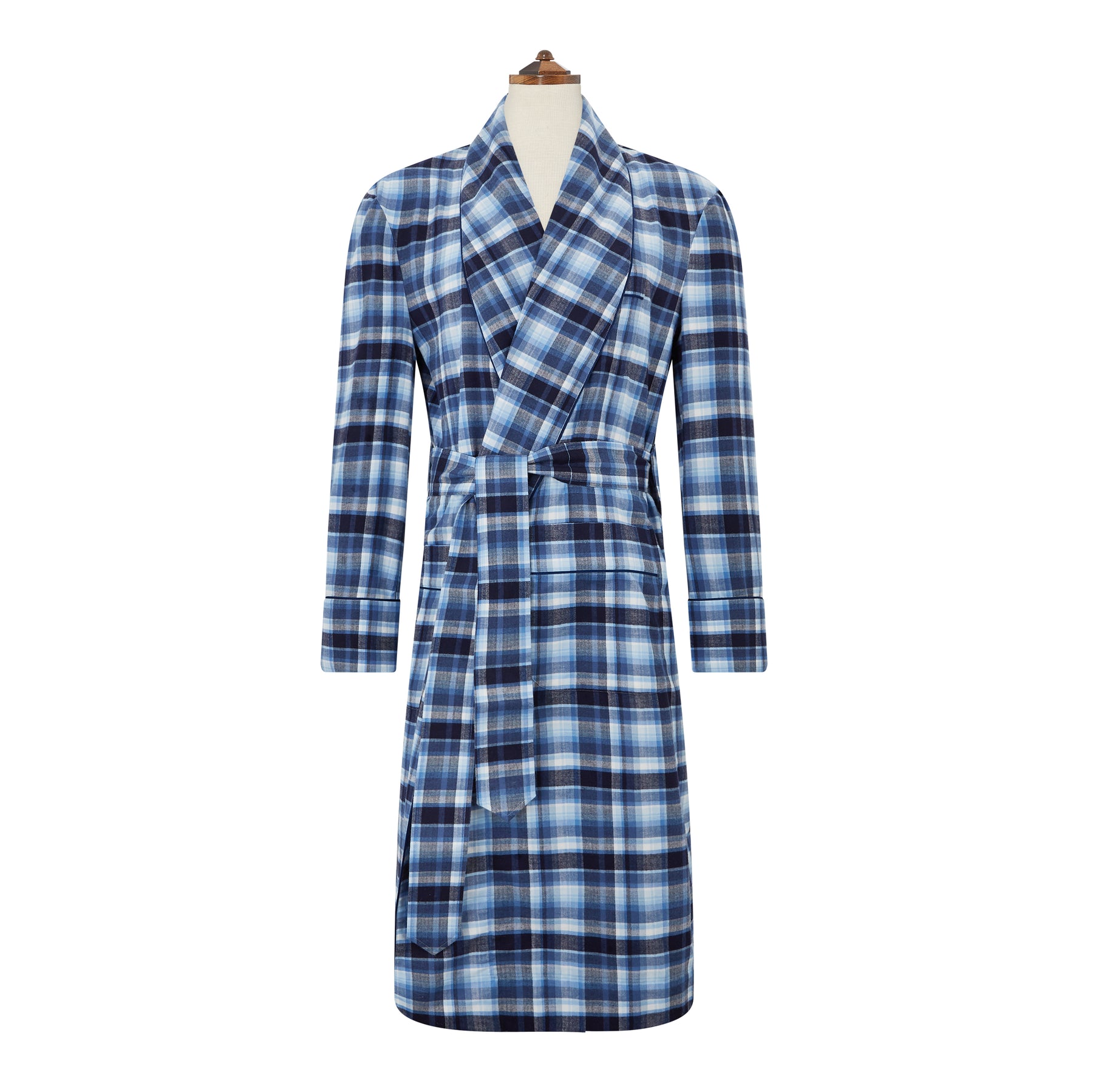 Our classic fit gown is offered in a fine brushed check cotton with contrast piping. Featuring a shawl collar, patch pockets and belt