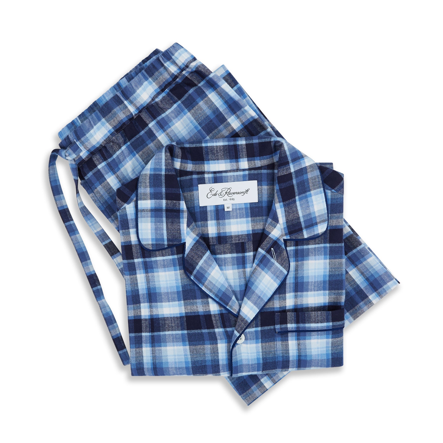 Our classic fit pyjama is offered in a fine brushed check cotton, featuring a camp collar shirt with a single chest pocket, contrast piping and mother of pearl buttons. Paired with an elasticated drawstring waist trouser with patch pocket.