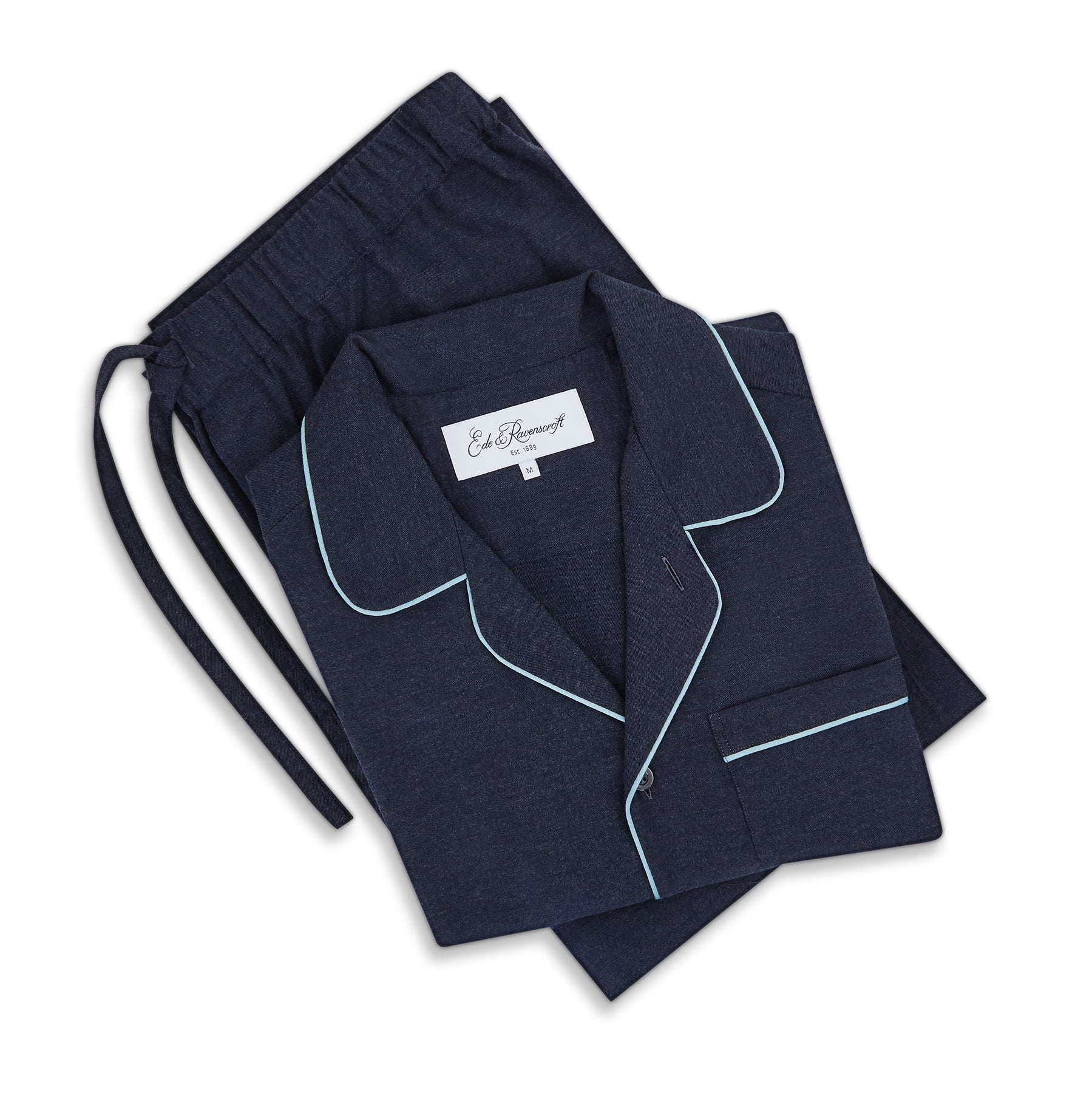 Our classic fit pyjama is offered in a fine Italian twill cotton, featuring a camp collar shirt with a single chest pocket, contrast piping and mother of pearl buttons. Paired with an elasticated drawstring waist trouser with patch pocket.