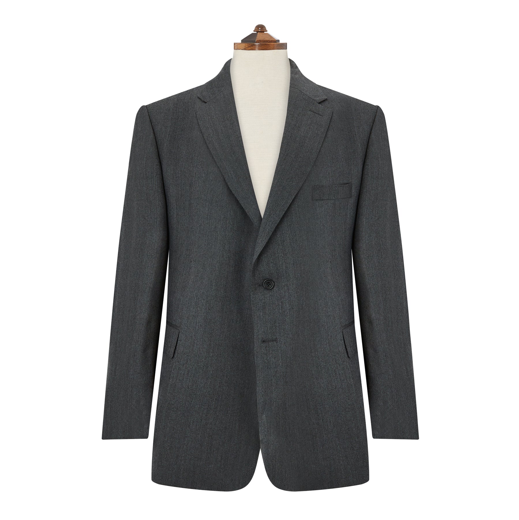 This classic fit suit is crafted from a classic herringbone wool. It comes with a single pair of pleated trousers.