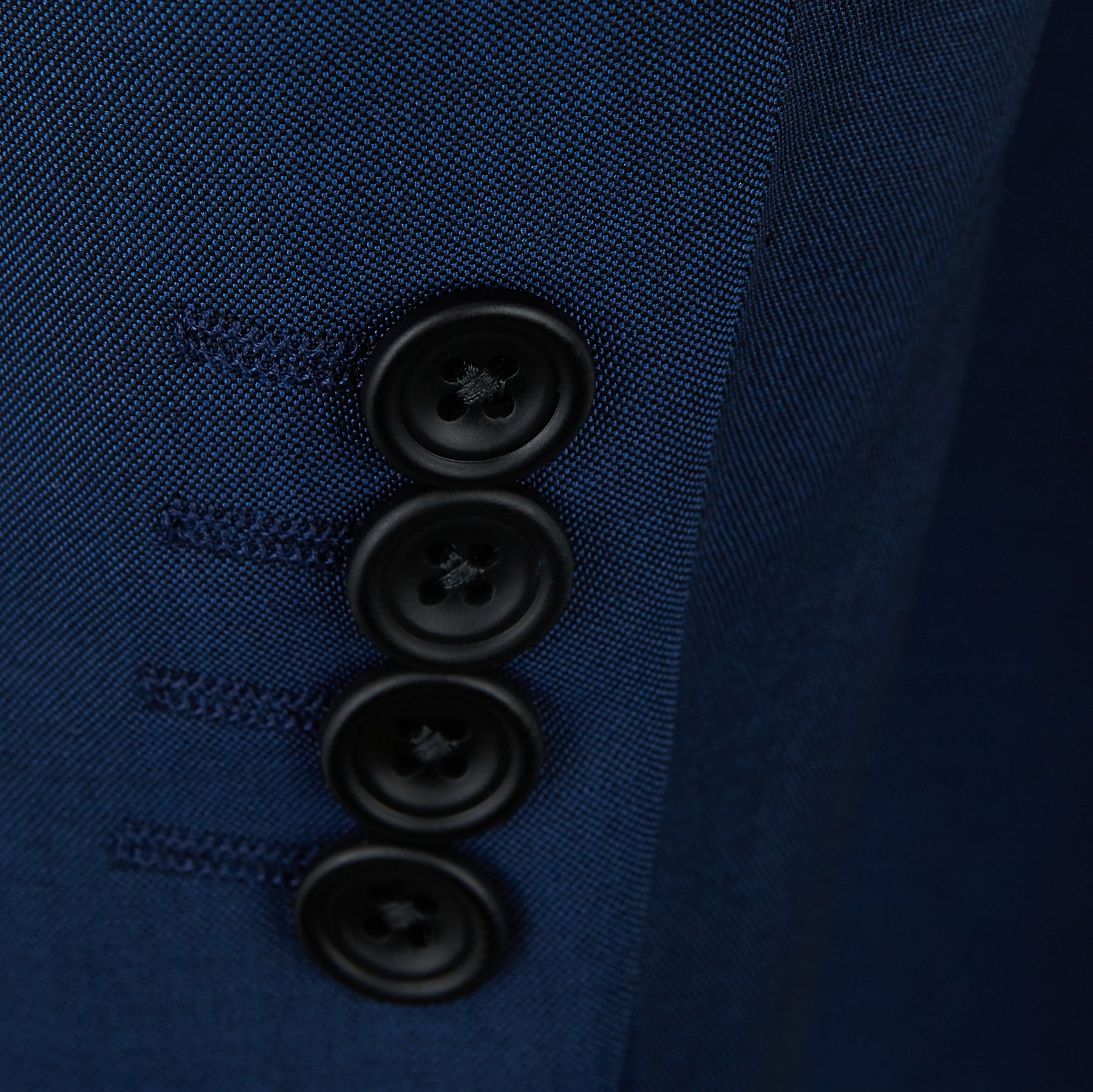 This slim fit suit is crafted from a classic plain weave wool. It comes with a single pair of flat front trousers.