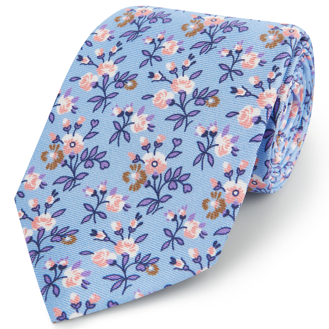Blue And Ivory Climbing Floral Printed Silk Tie