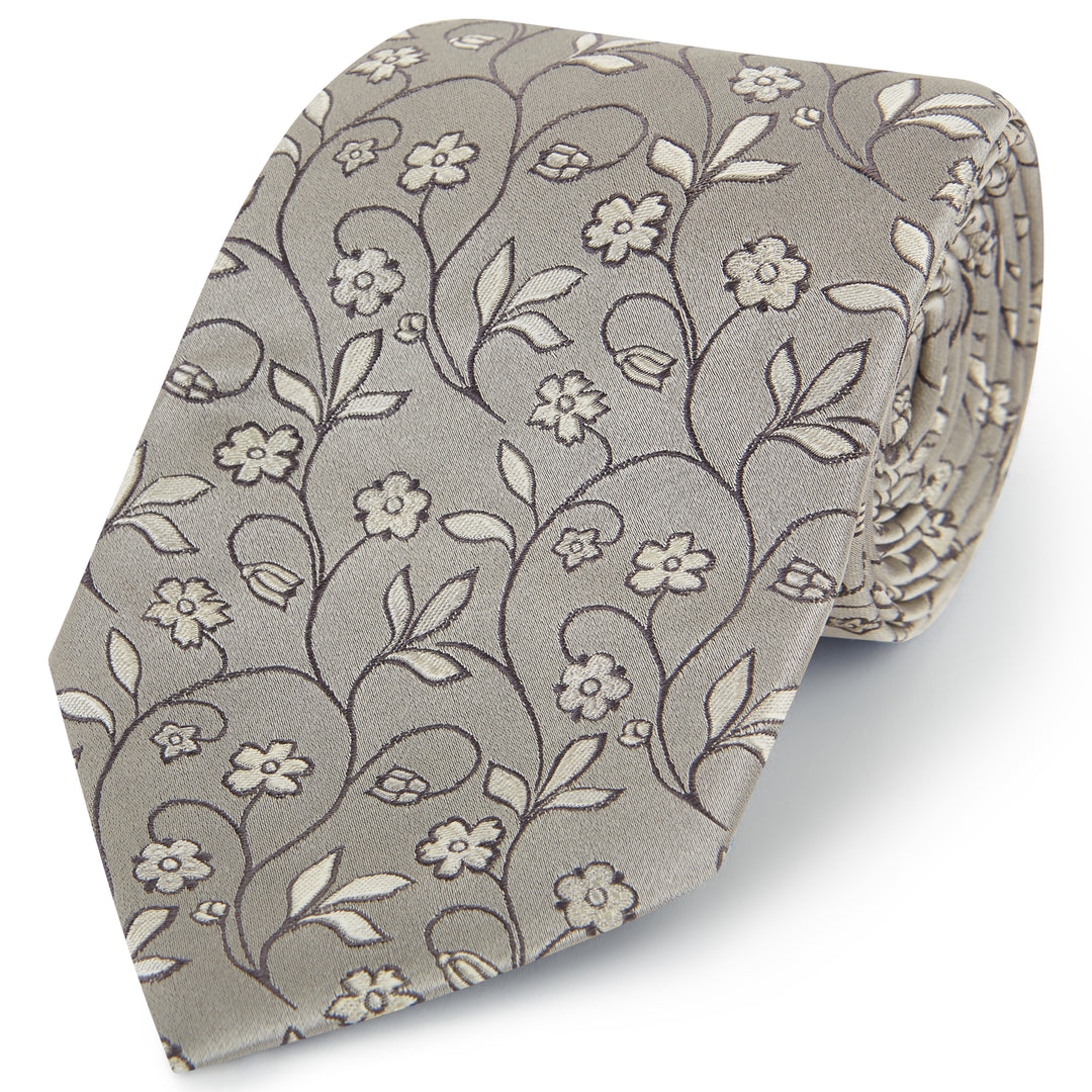 Grey Large Floral Sateen Jacquard Woven Silk Tie