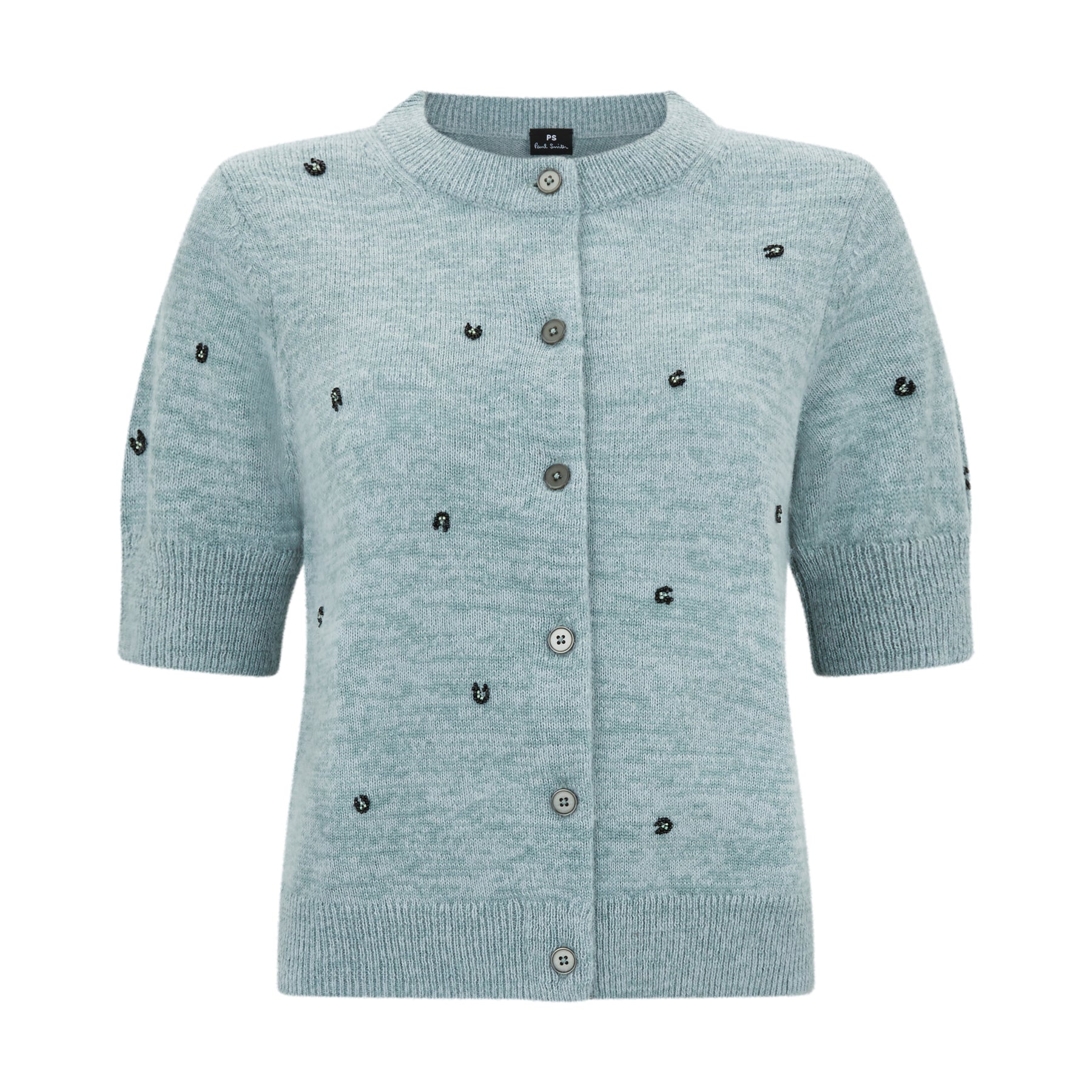 Paul Smith short-sleeve cardigan features beaded embroidery detailing throughout the cardigan. Featuring classic ribbed trims, this cardigan is complete with metallic button fastening. Also available in black.