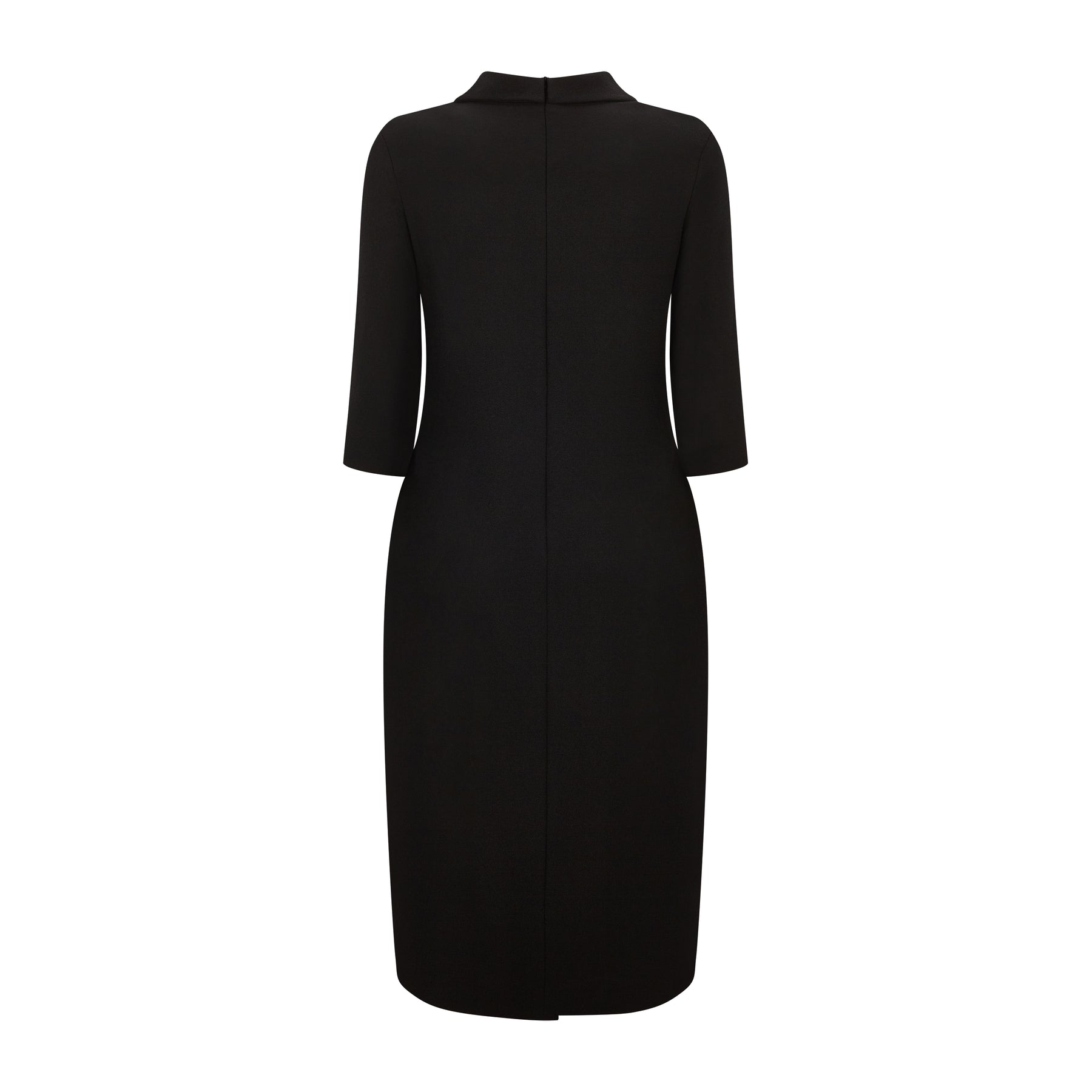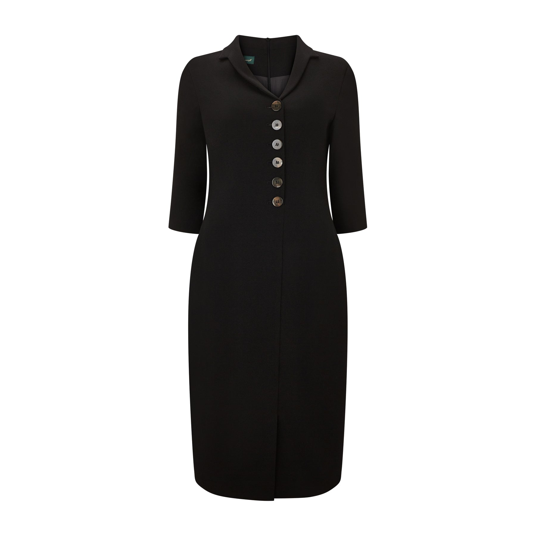 The Paula suit dress features a sleek, fitted silhouette with a sharp collared neckline and elegant three-quarter sleeves. Its standout front design includes off-centre statement buttons, a tailored vertical seam, and a front vent, creating a modern double-breasted power-dress effect that exudes confidence and sophistication. Invisible centre back fastening.