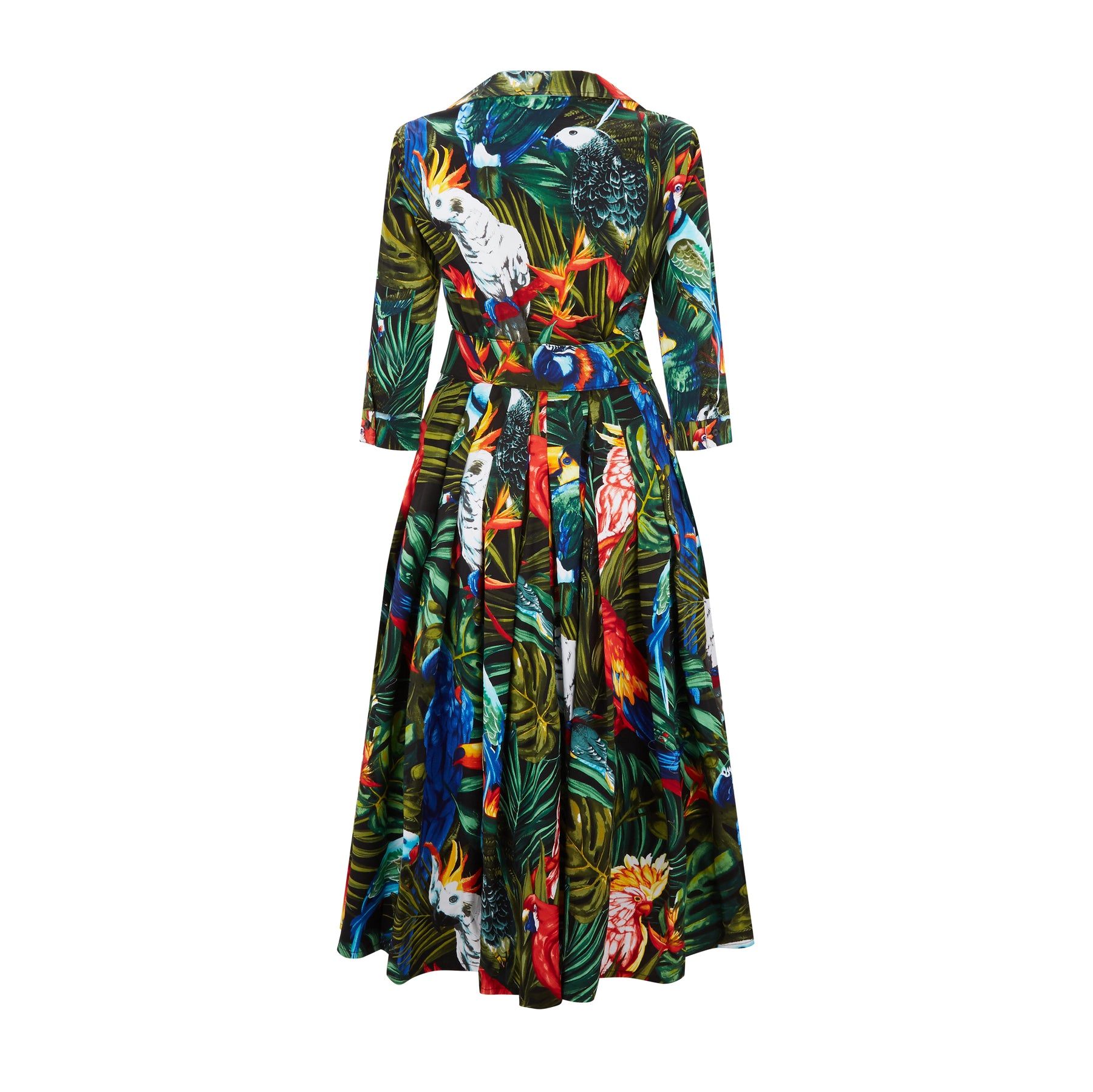 The Samantha Sung Audrey dress is beautifully made and a wardrobe staple. The upper body is fitted with 3/4 length sleeves while the mid length skirt creates a flattering silhouette. The choice of waist belts allows you to customise and adapt your look. This dress presents a beautiful green with a parrot design.