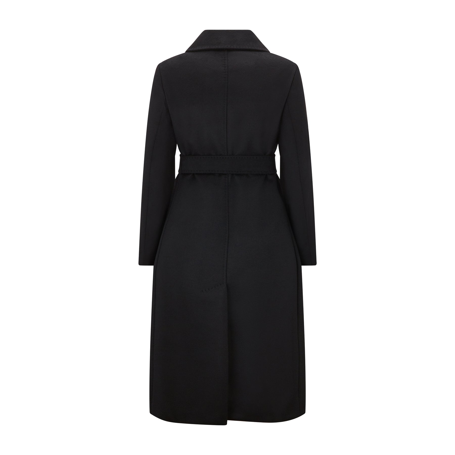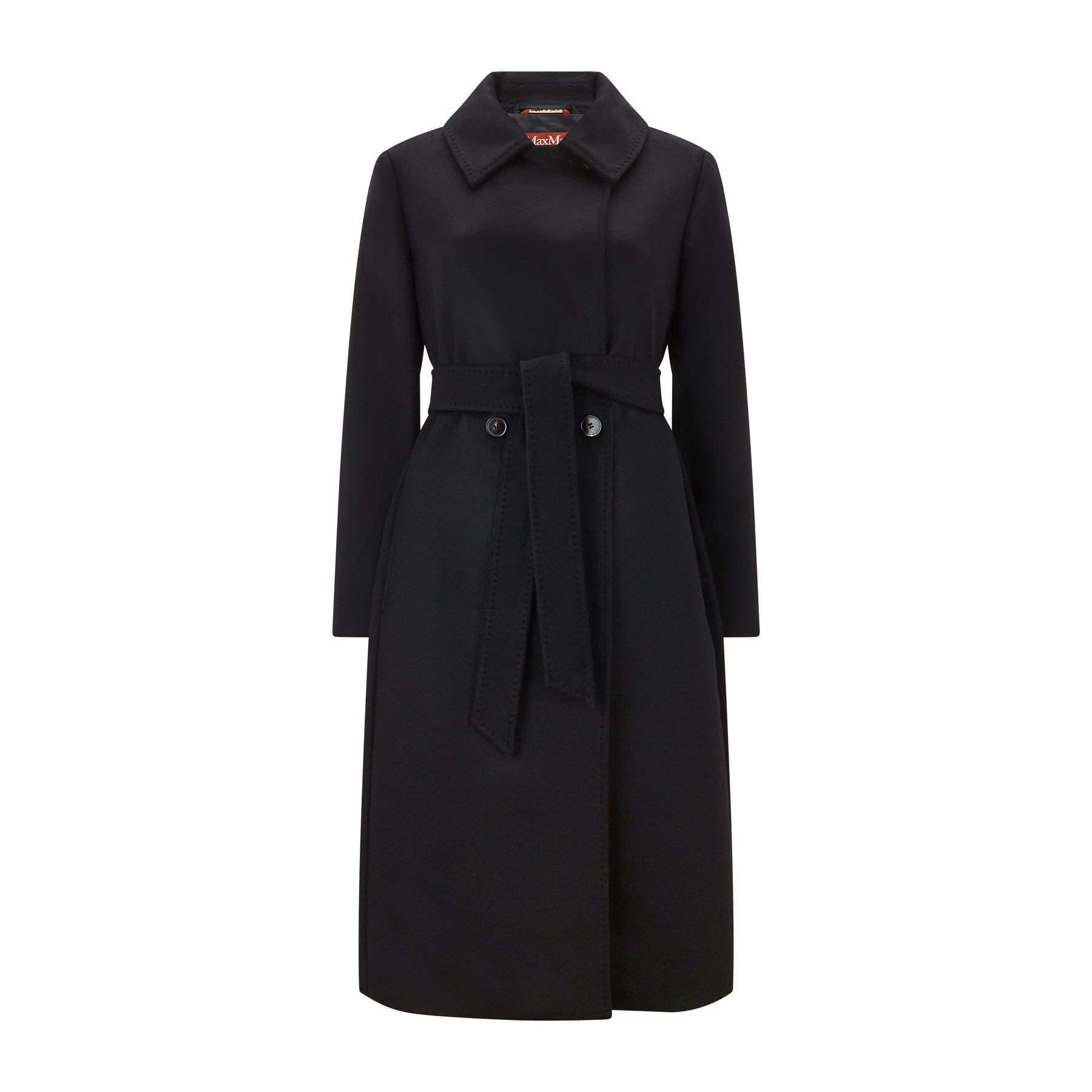 This long, double-breasted robe-inspired Max Mara coat features long sleeves, side pockets and concealed buttons with matching belt at the waist. Featuring a double function pointed collar to be worn open with lapels or fastened with button.