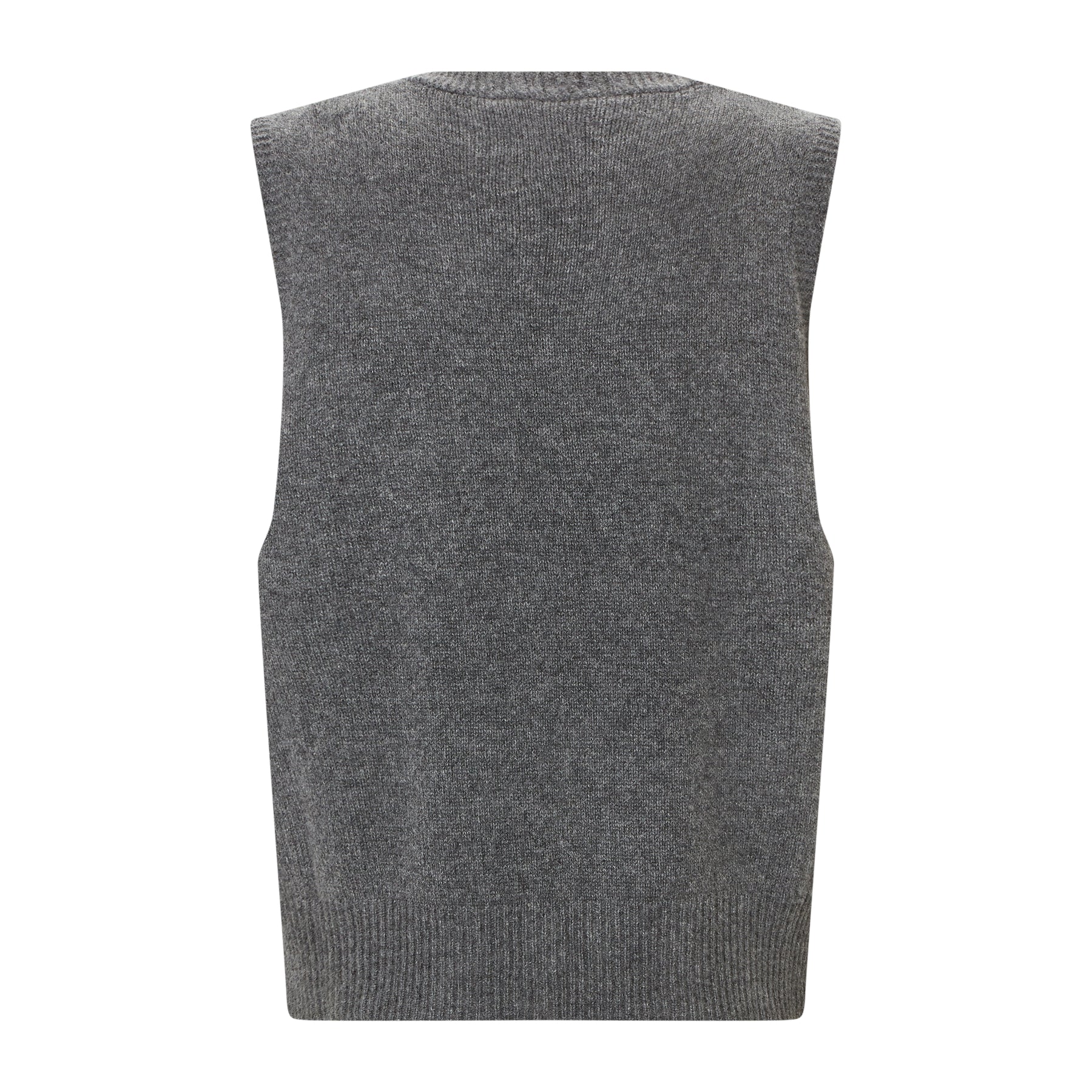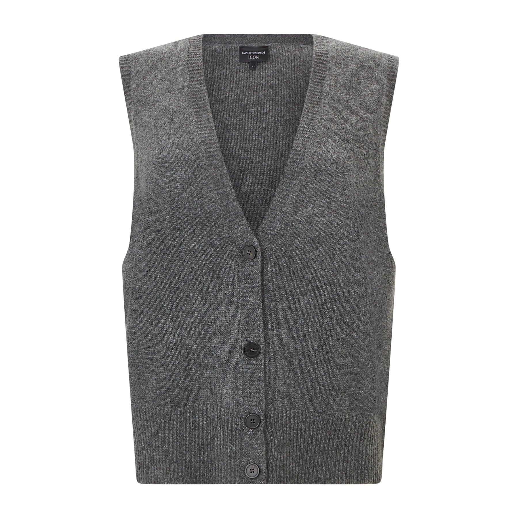 V-neck single-breasted waistcoat with button closure at the front. The plain-knit pure cashmere creates a warm, smooth texture that is cosy and comfortable, complementing winter season everyday looks. The garment is part of the Icon capsule collection