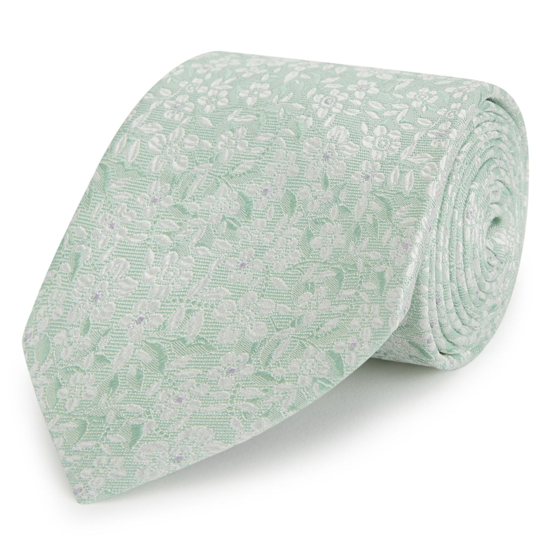 This softly coloured tie features a repeat floral motif on a texture ground, the perfect accompaniment to a suit for formal occasions