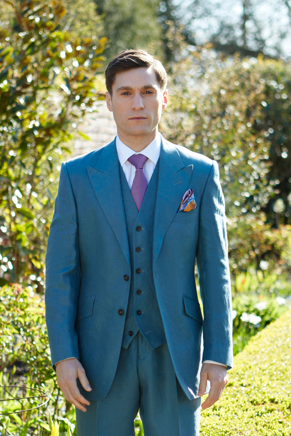 Made from Irish linen, this single breasted waistcoat has a six button closure and an adjustable satin back. Wear with the matching jacket and trousers for the perfect summer look