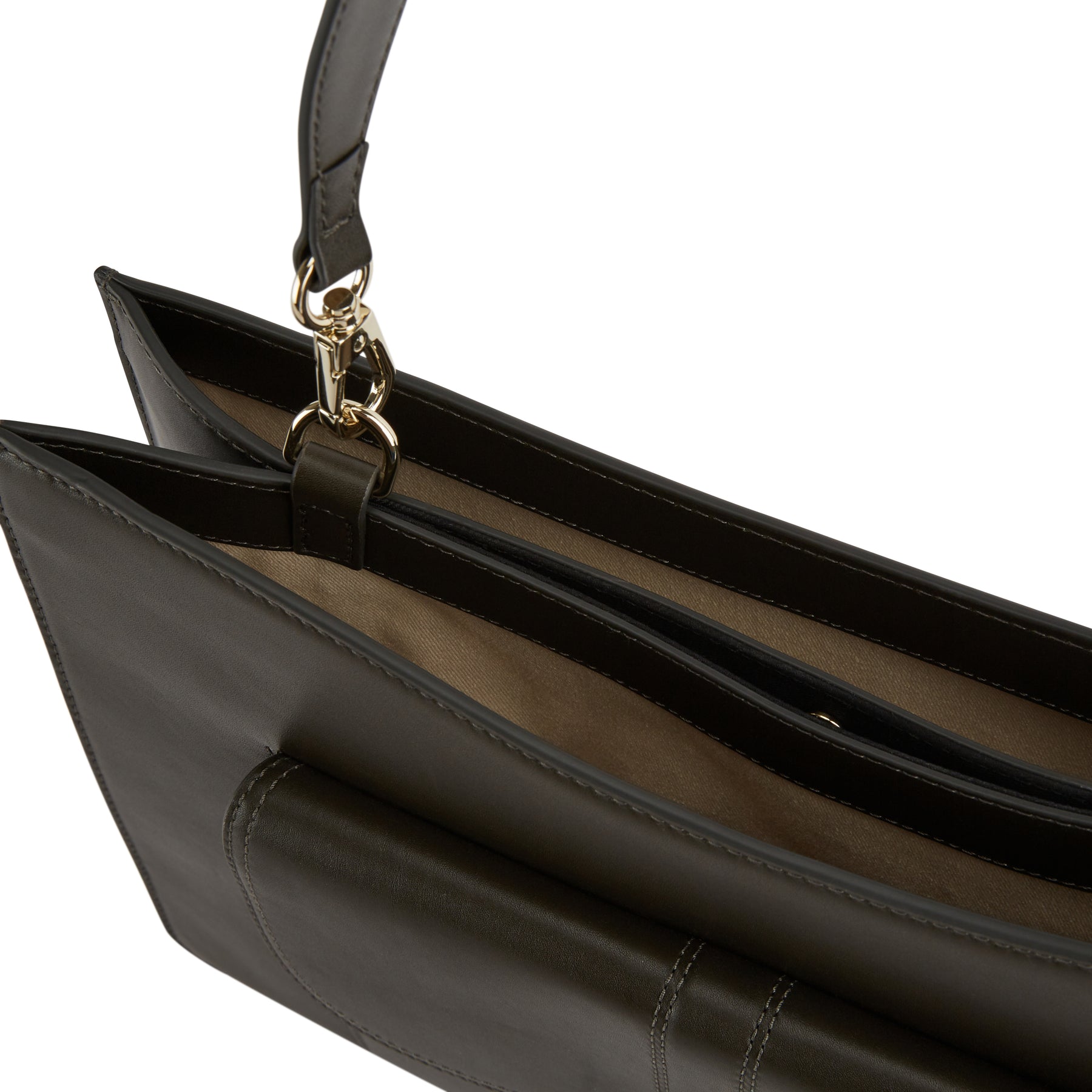 Satchel bag crafted in leather, single handle with a detachable shoulder strap. Featuring two main compartments and a outer front pocket with a turn-lock closure.