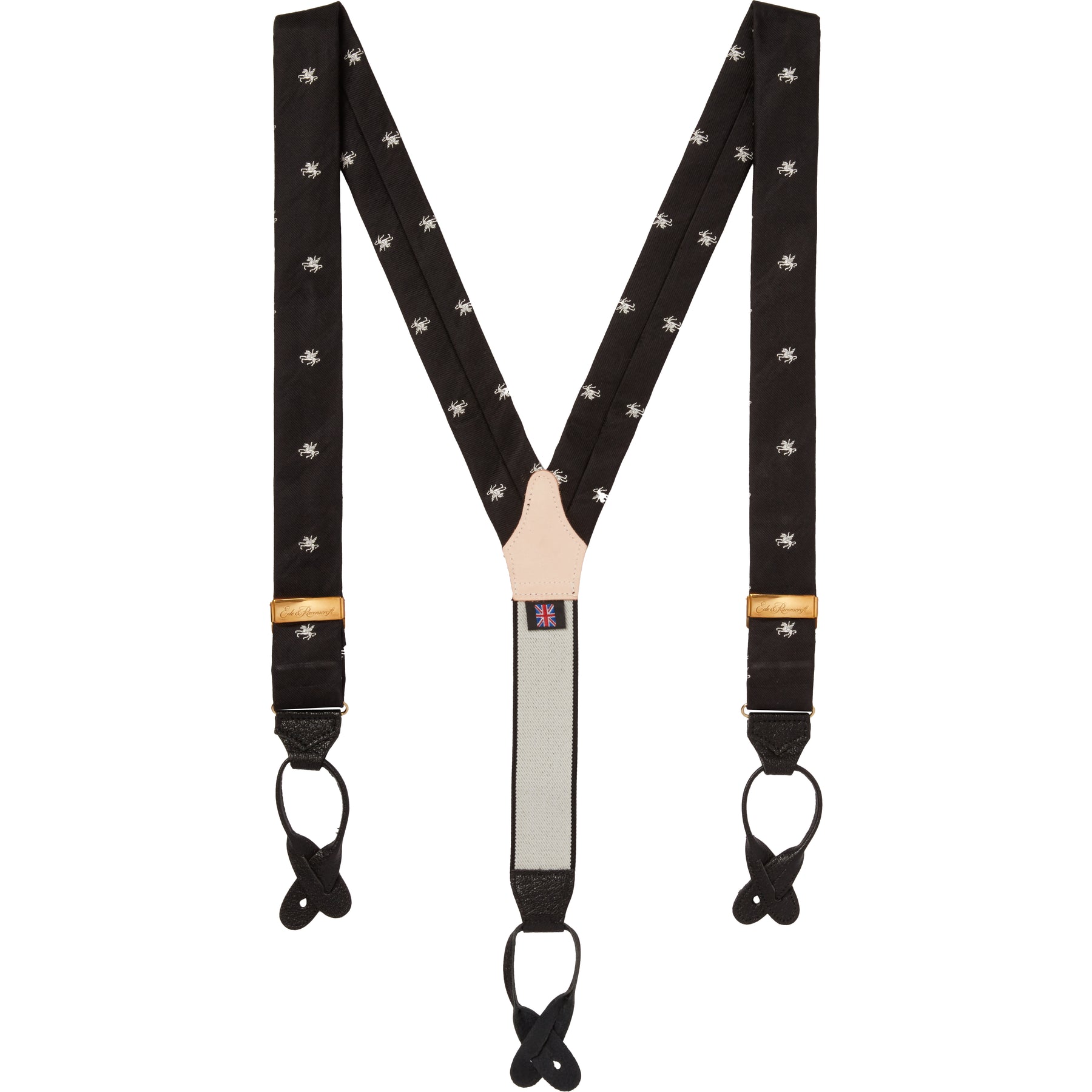 Crafted in England these silk braces in the colours Navy and Red, Middle Temple feature black leather button ends and engraved hand polished brass levers. Fully adjustable they make a stylish alternative to a belt.