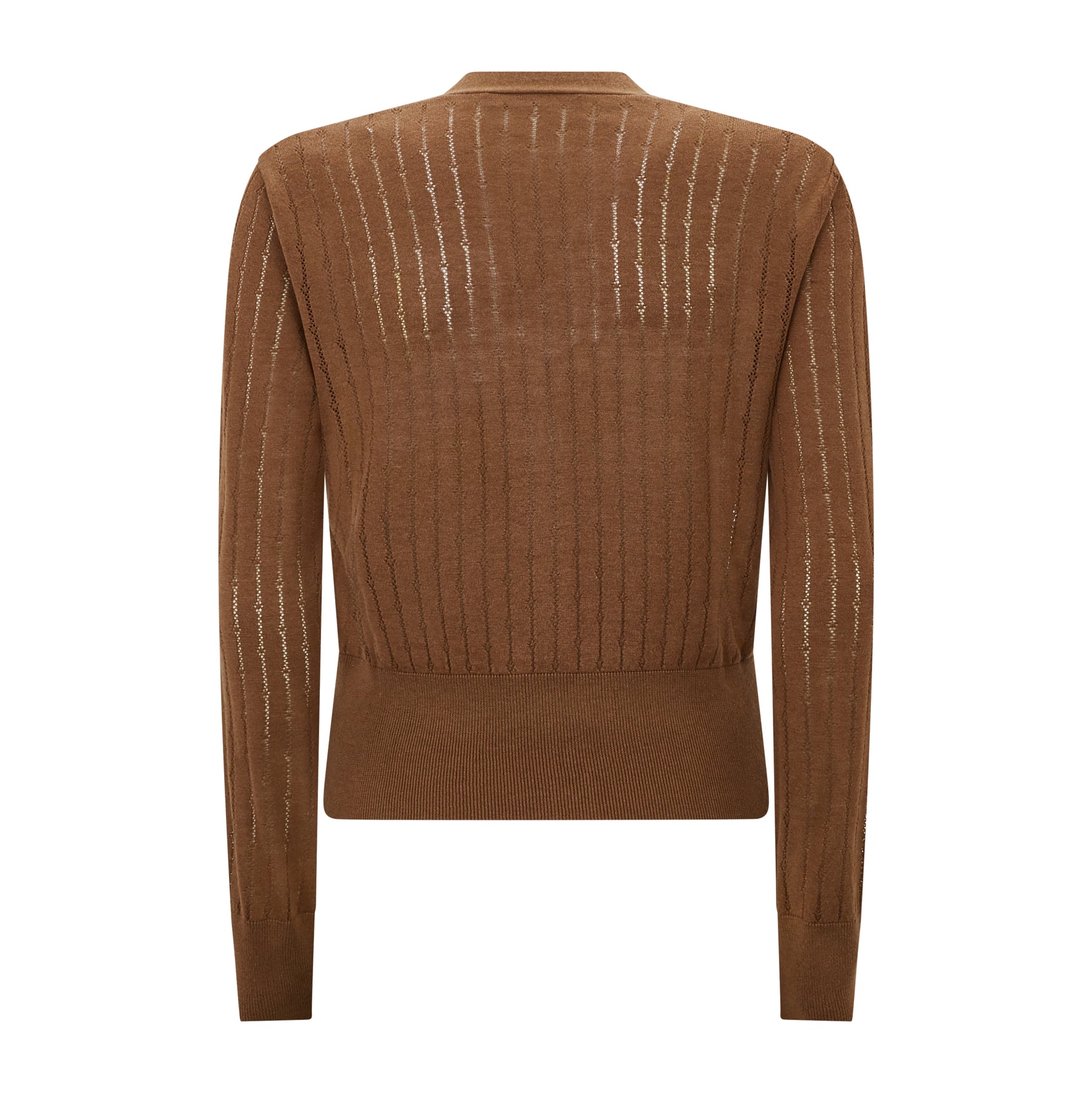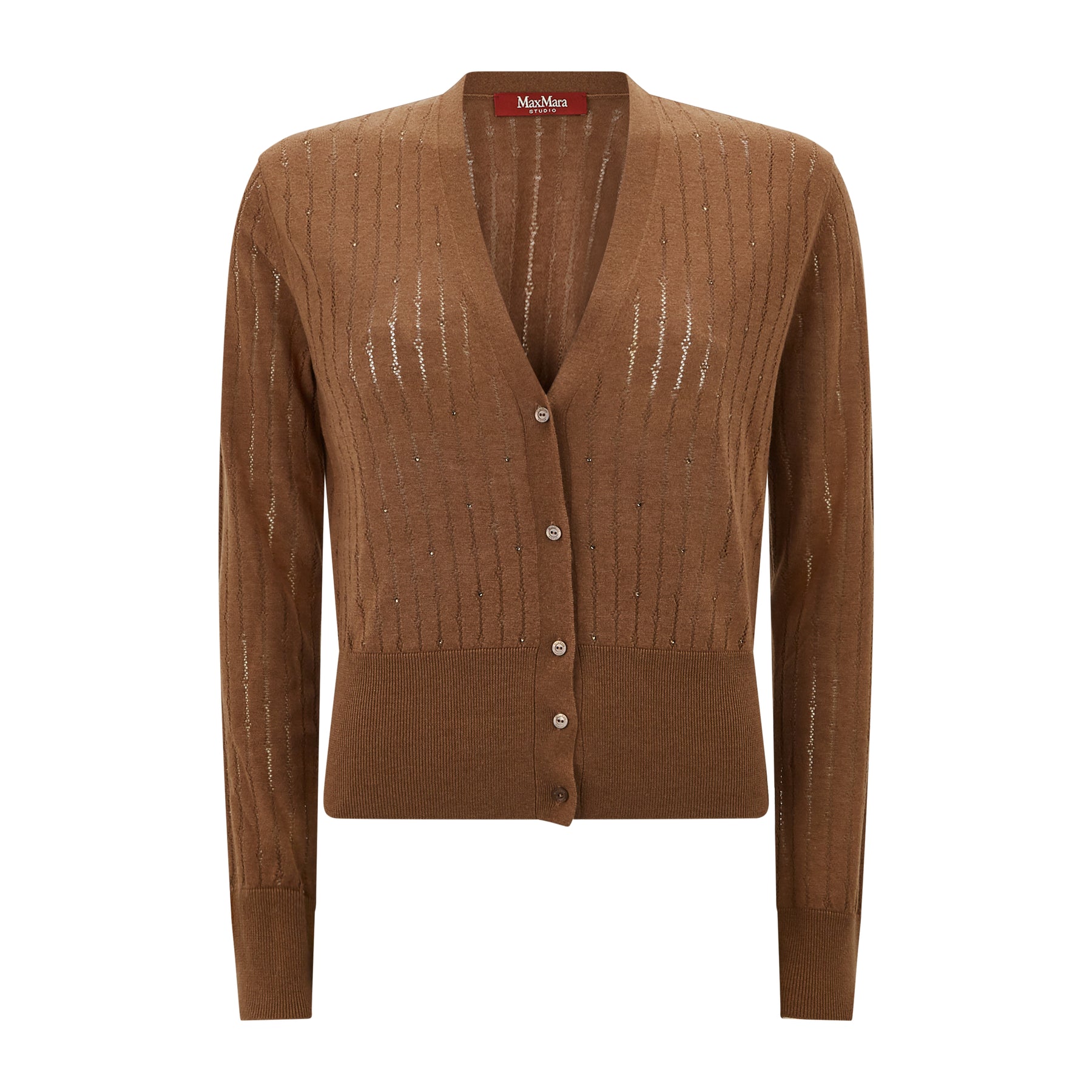 This Max Mara Studio V-neck cardigan features long sleeves, fitted lines, ribbed trimmed hem and high cuffs. Front buttons for closure.