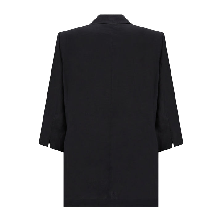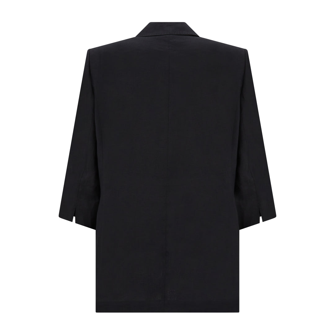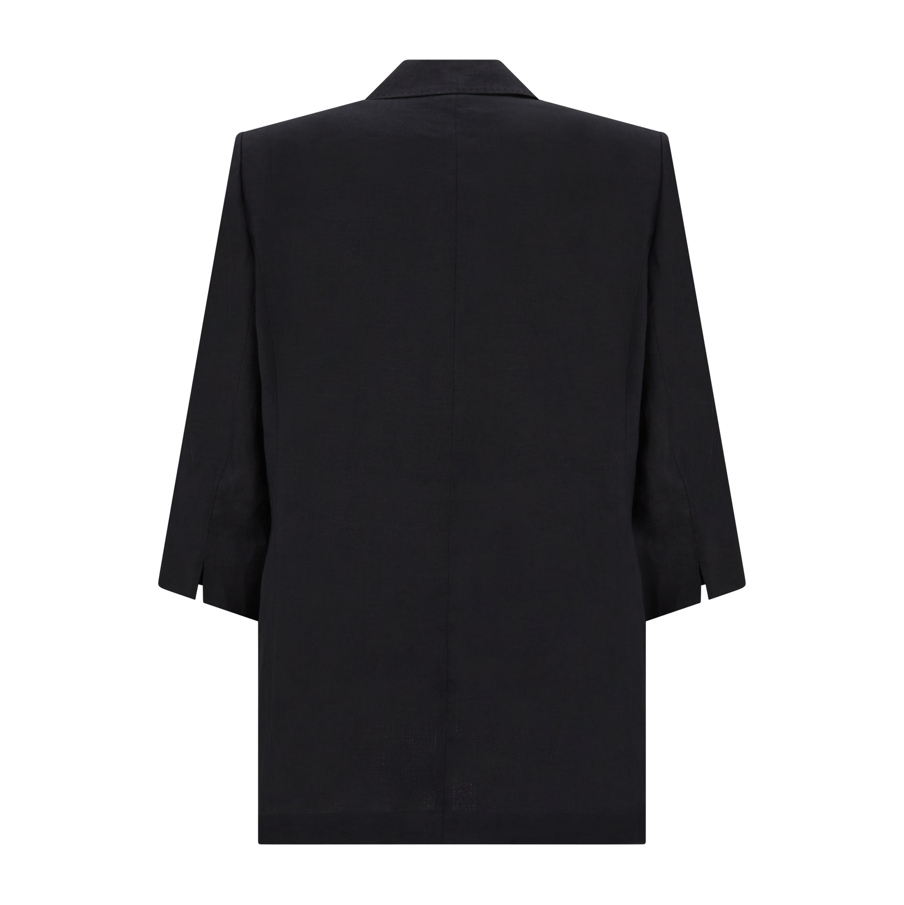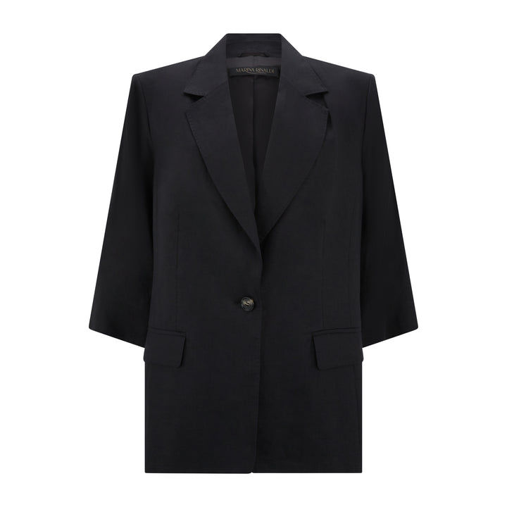 Marina Rinaldi Sabadel linen jacket features lapel collar, three-quarter sleeves with slits and pockets with double welt and flap. Has a one button closure on the front. Pair with Remo Linen Trouser for the perfect look.