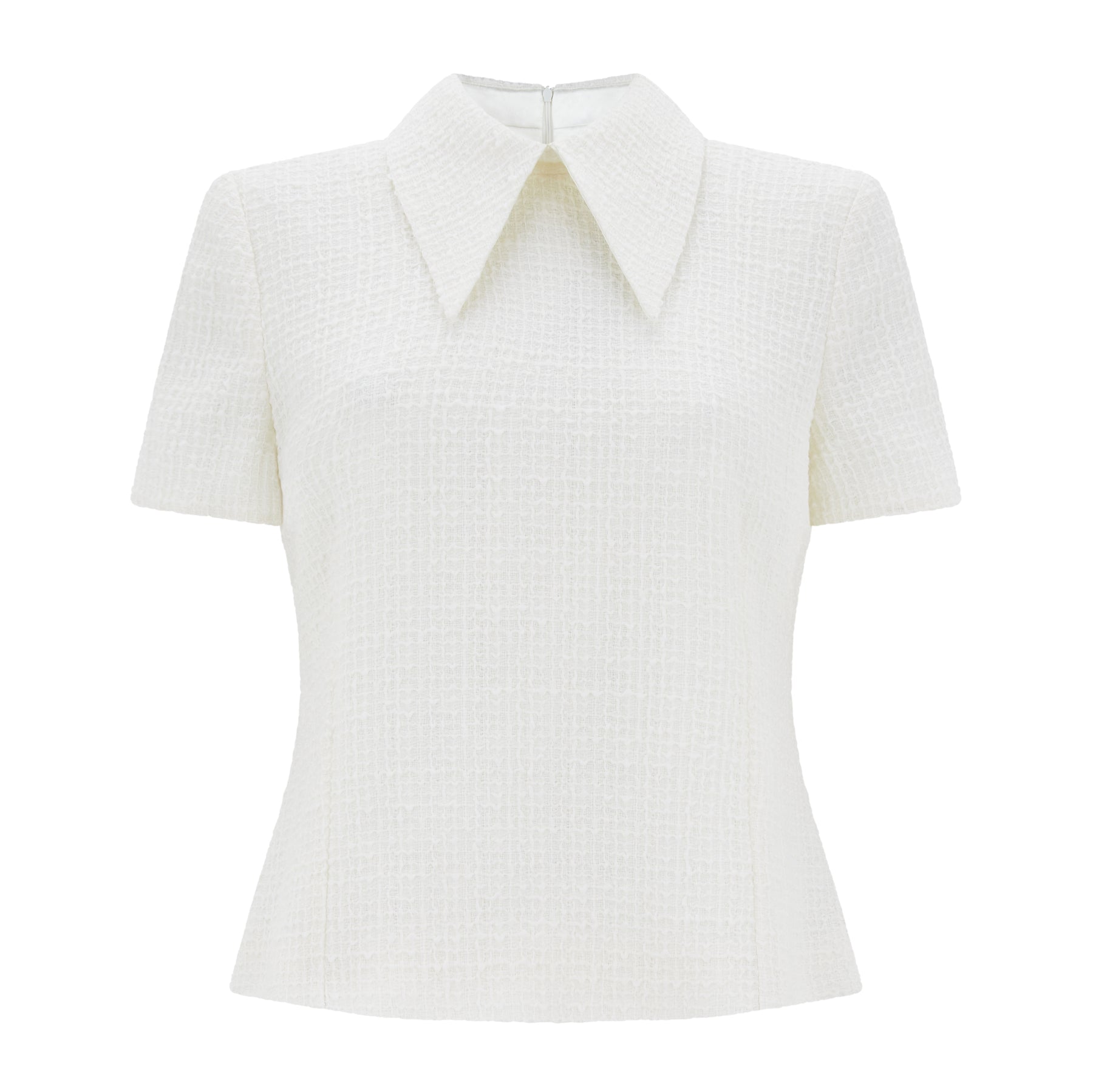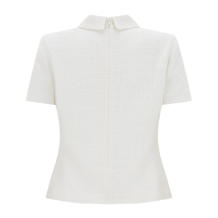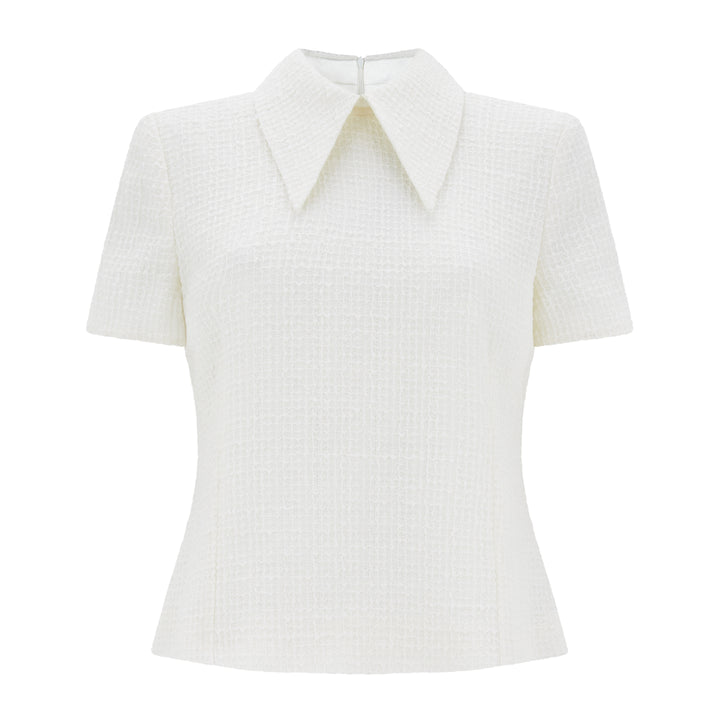 A Short sleeved fitted shirt featuring fabulous dagger collar. Concealed centre back zip for closure. Pair with Sloane summer tweed skirt for the prefect look.